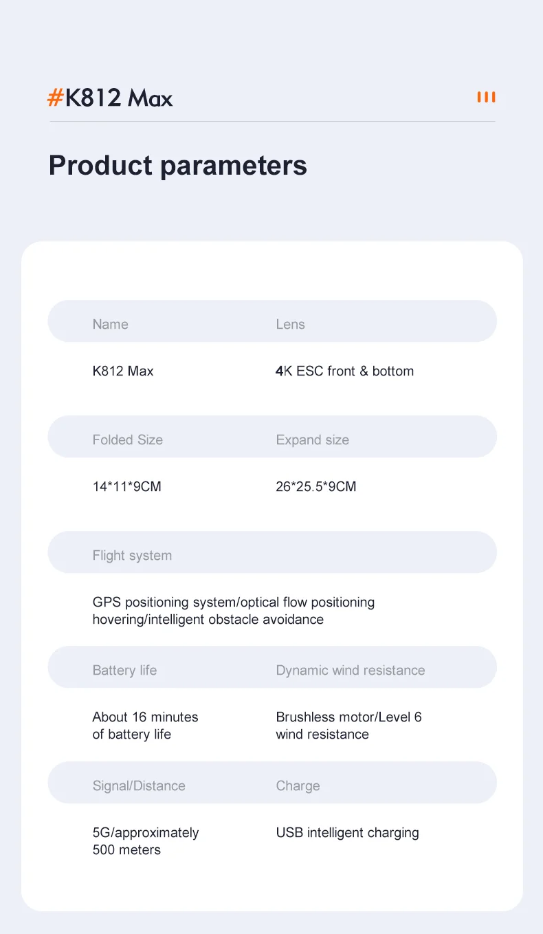 Remote Control Function: One-click takeoff/One-click landing/Ascend/Descend/Left/Right/Headless Mode/Fast and Slow/One-click return/Camera pitch control/One-click return