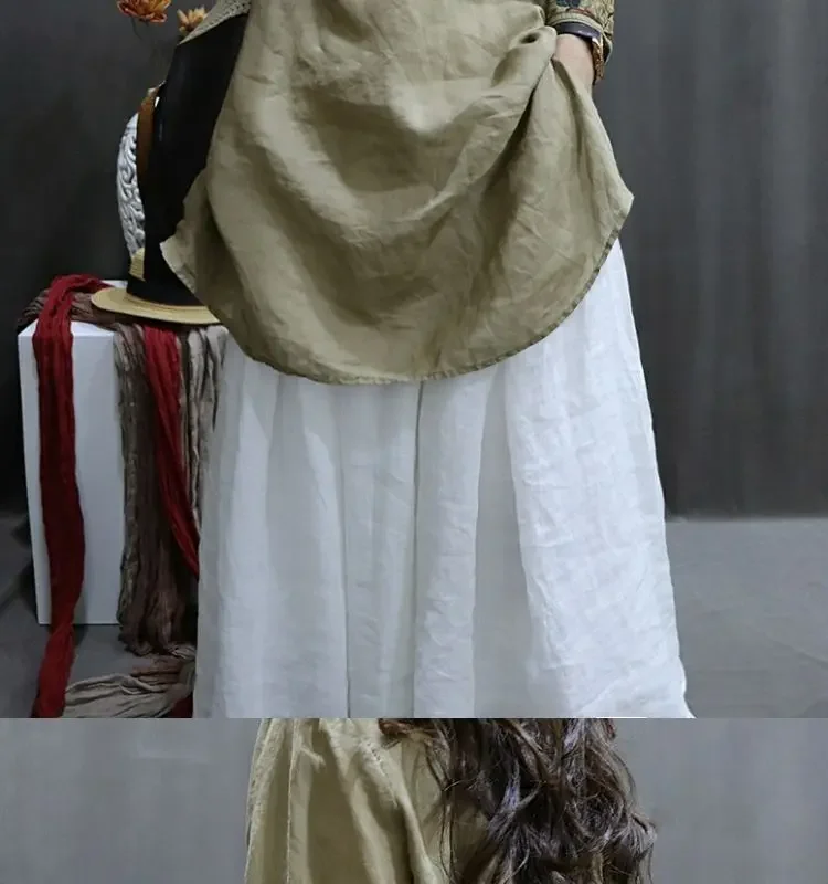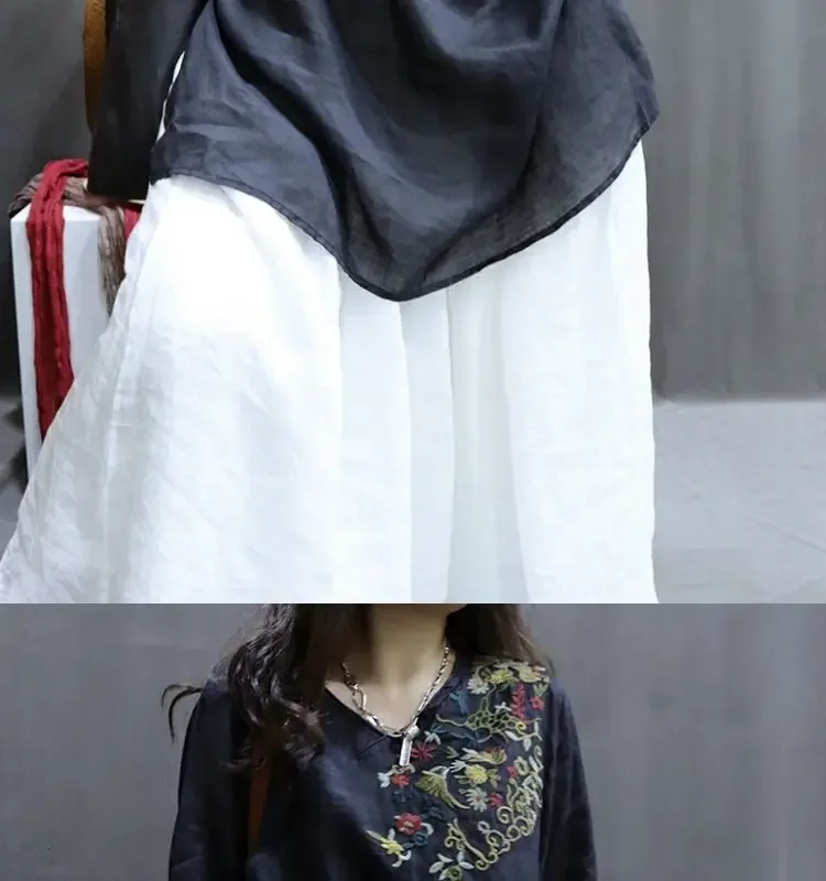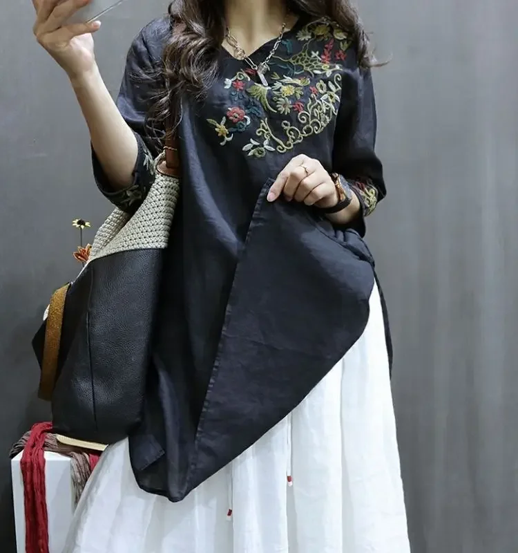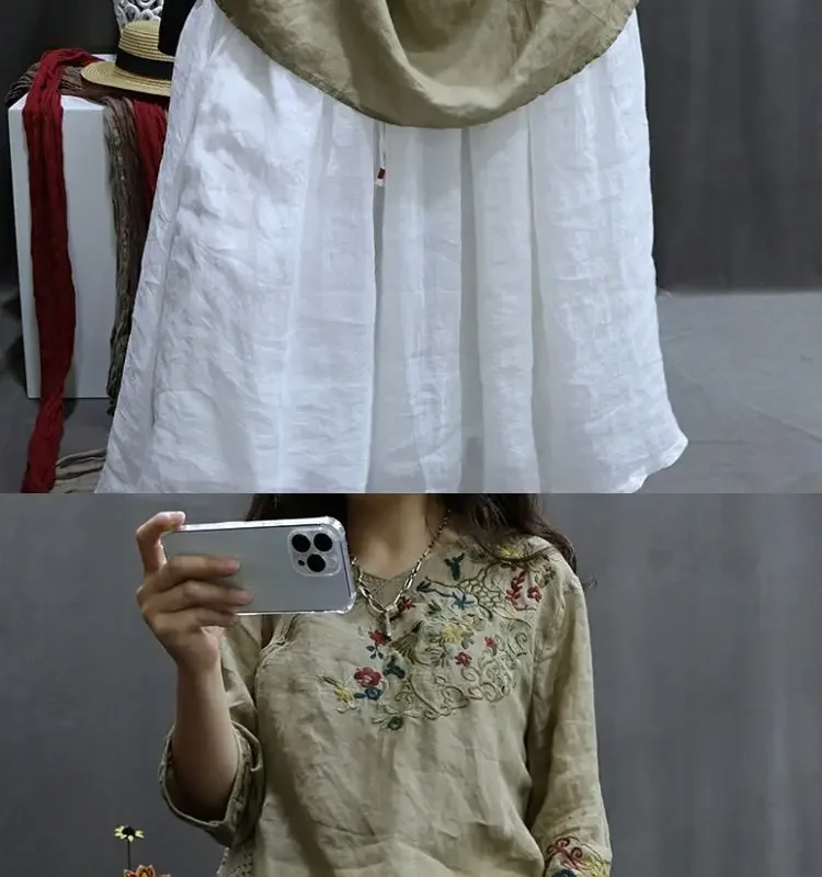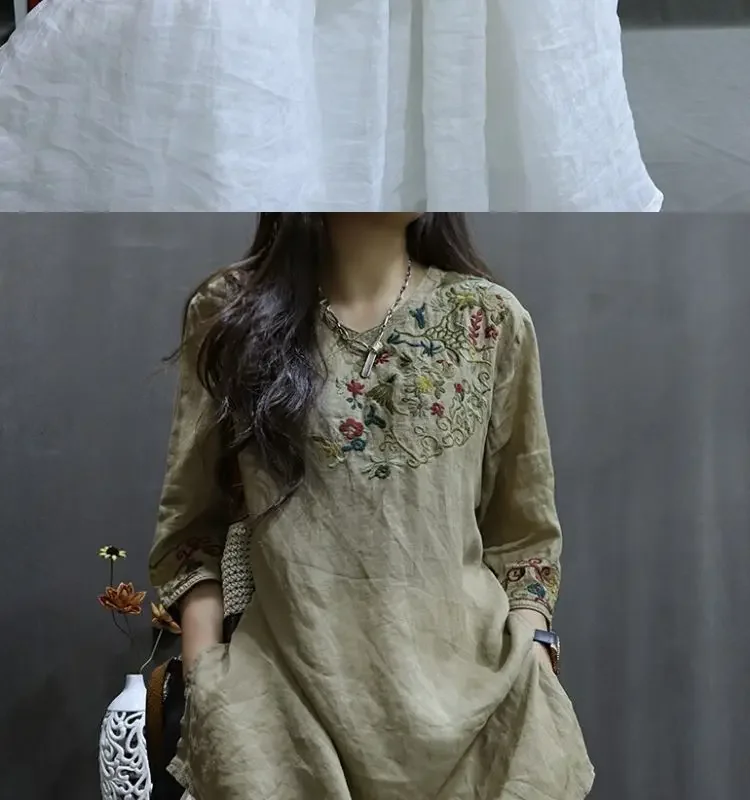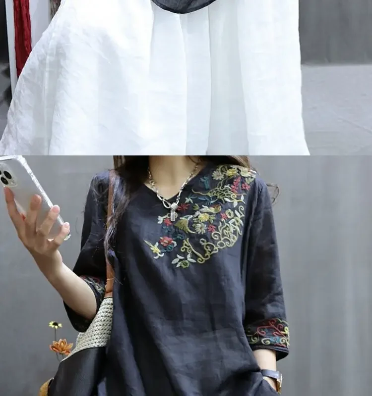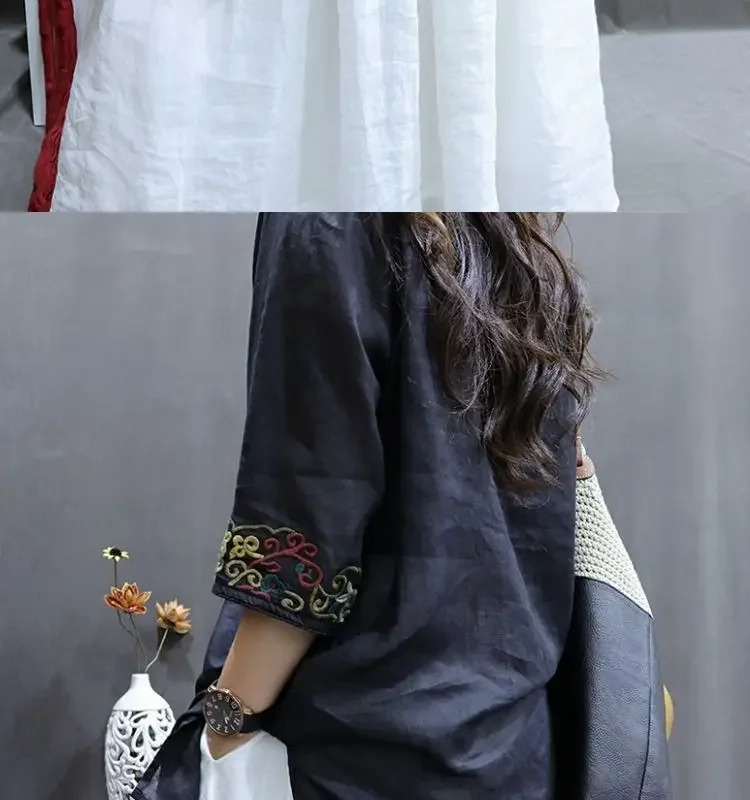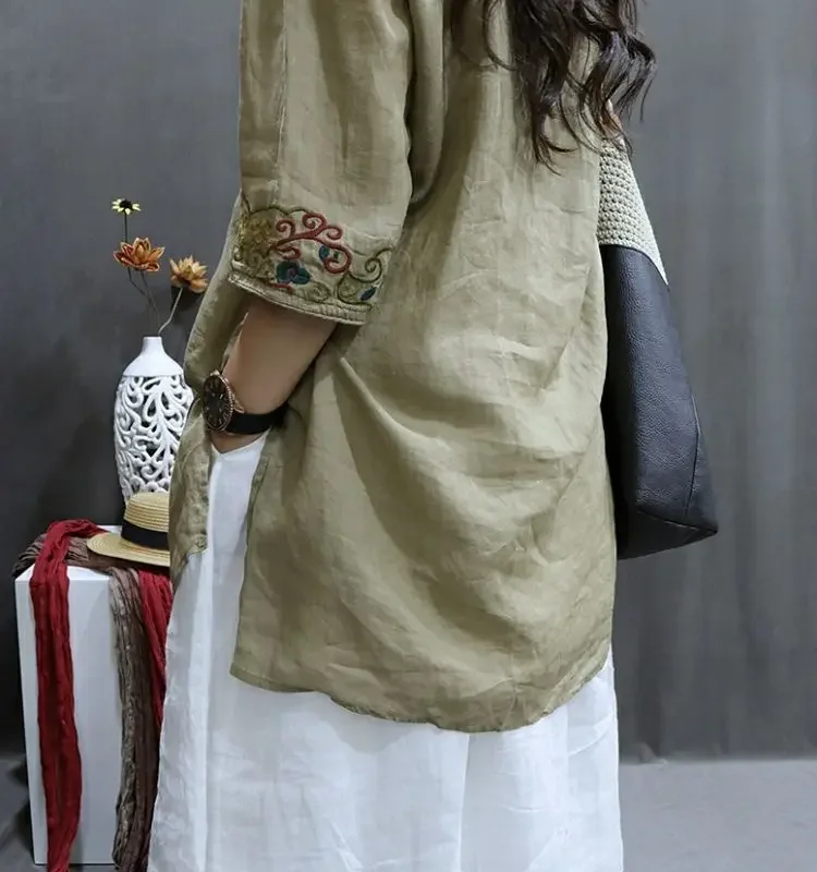 Cotton and Linen Women Clothing 2025 Summer New Print Retro Embroidery Loose Slim and Fashionable Shirt
