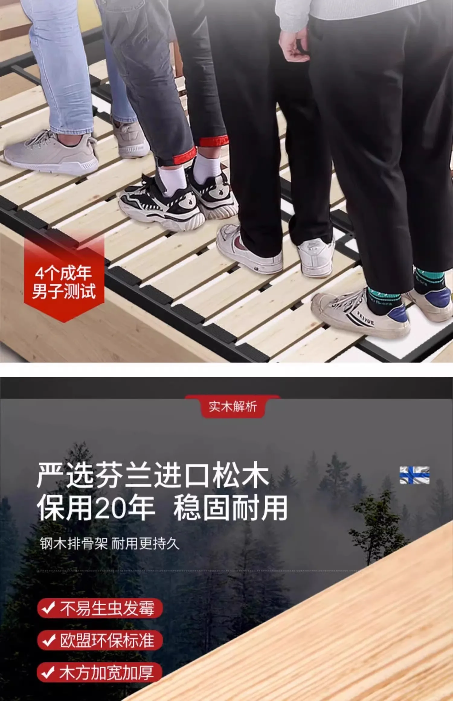7. Pine imported from YEATION and Finland is guaranteed for 20 years, which is stable and durable, and the steel raft skeleton is more durable.