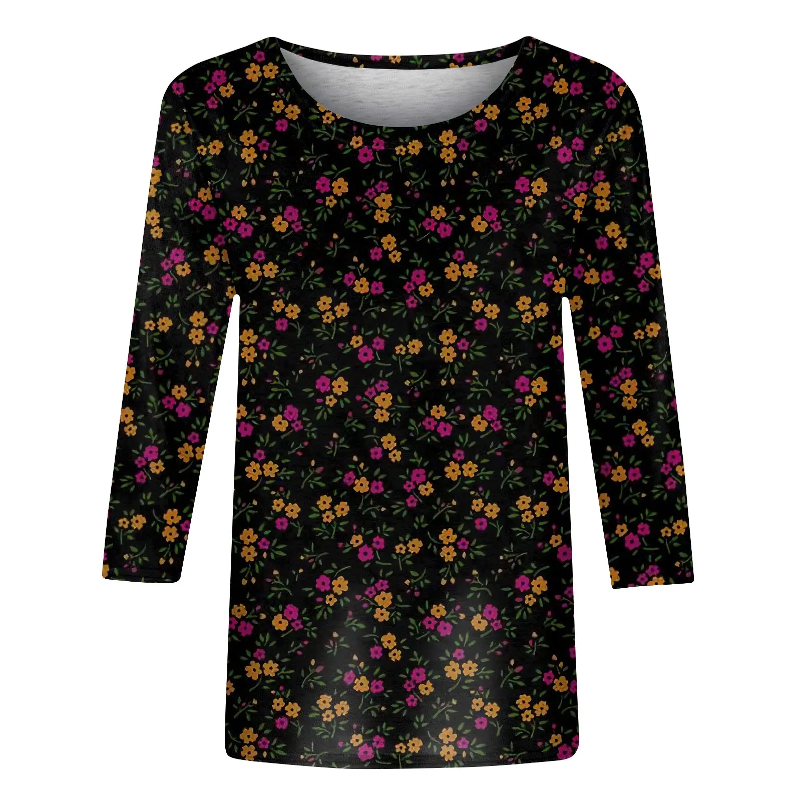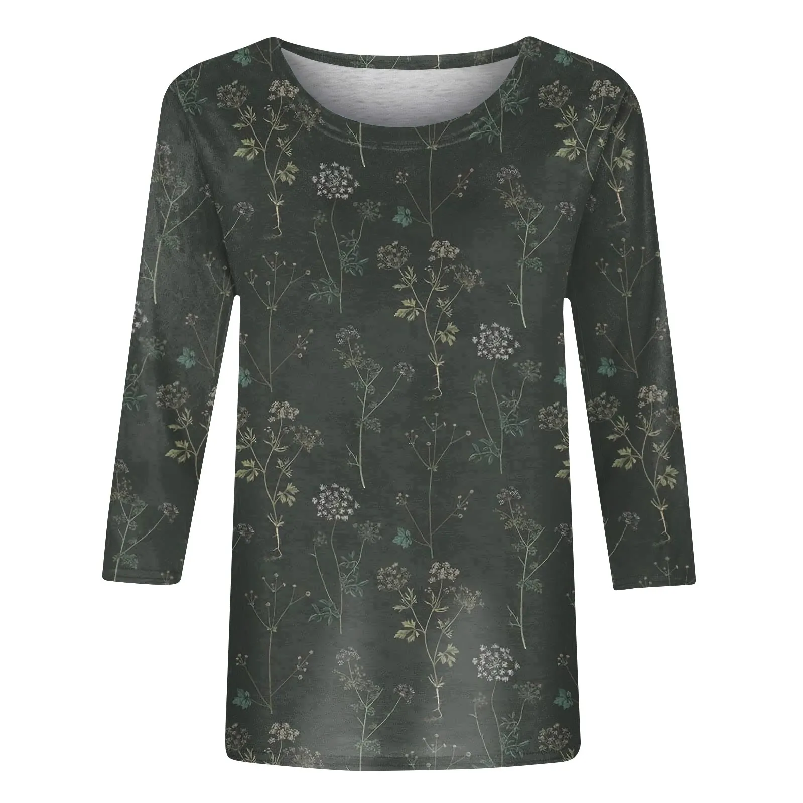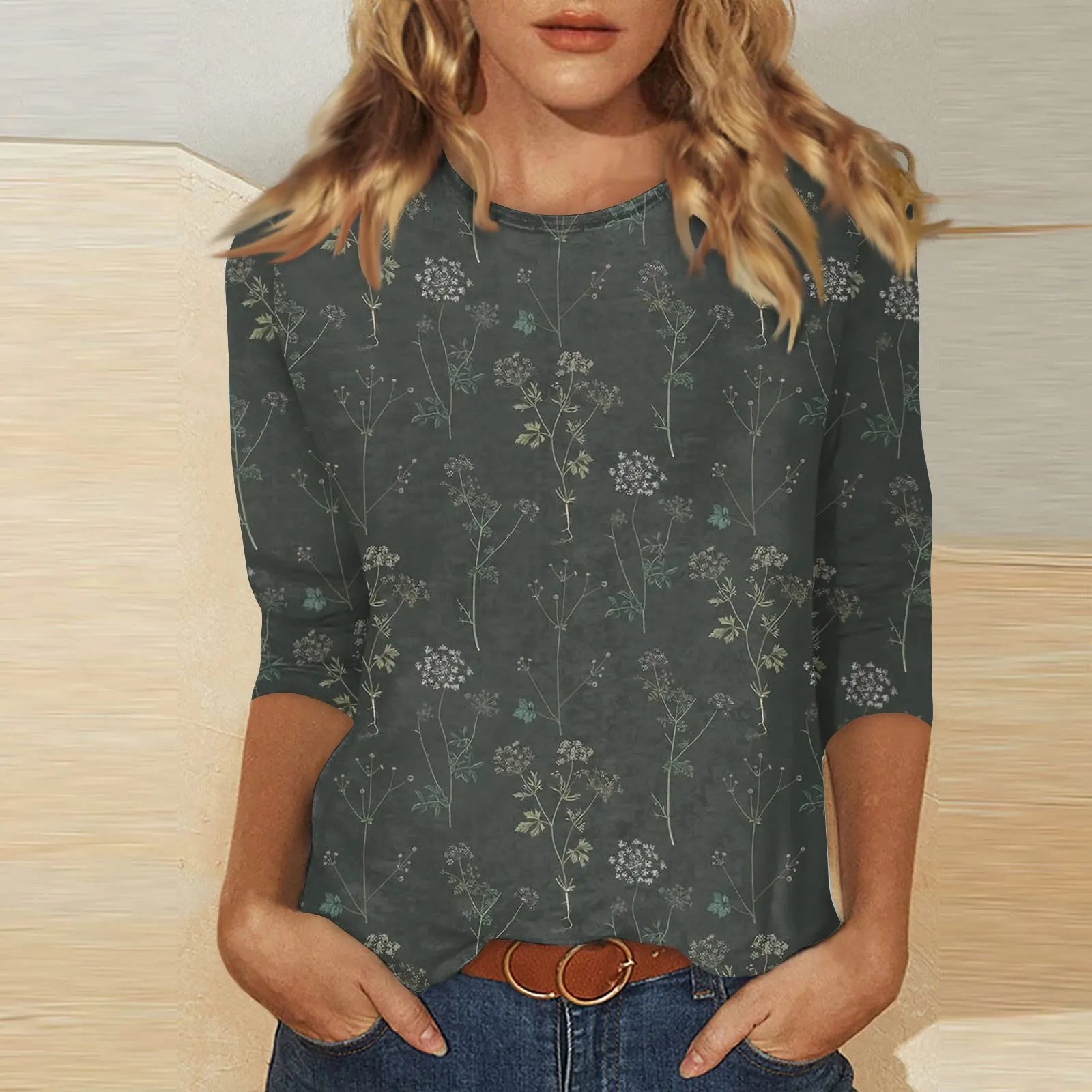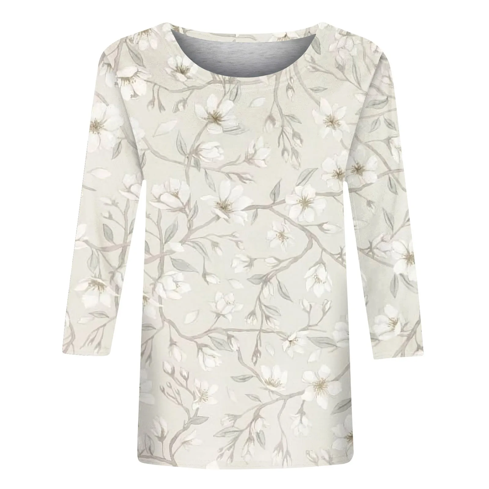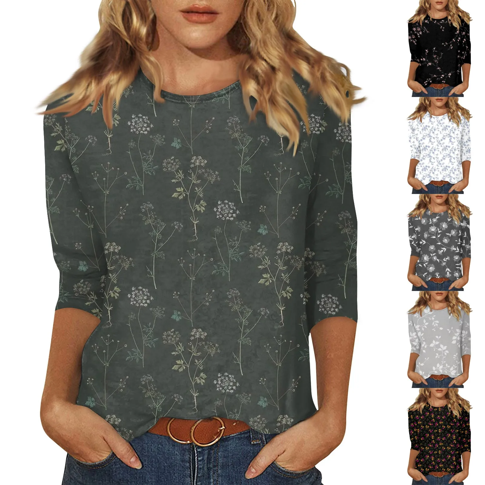 Female Clothing Delicate Fashion Shirts Floral Round Neck 3/4 Sleeves Printed Summer Women Pullover Daily Wear Vetement Femme
