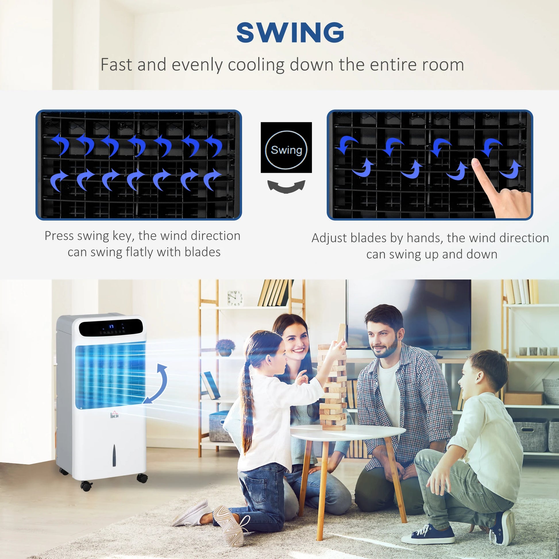 ● Features 60° oscillation for wide coverage and manually adjustable vertical air flow