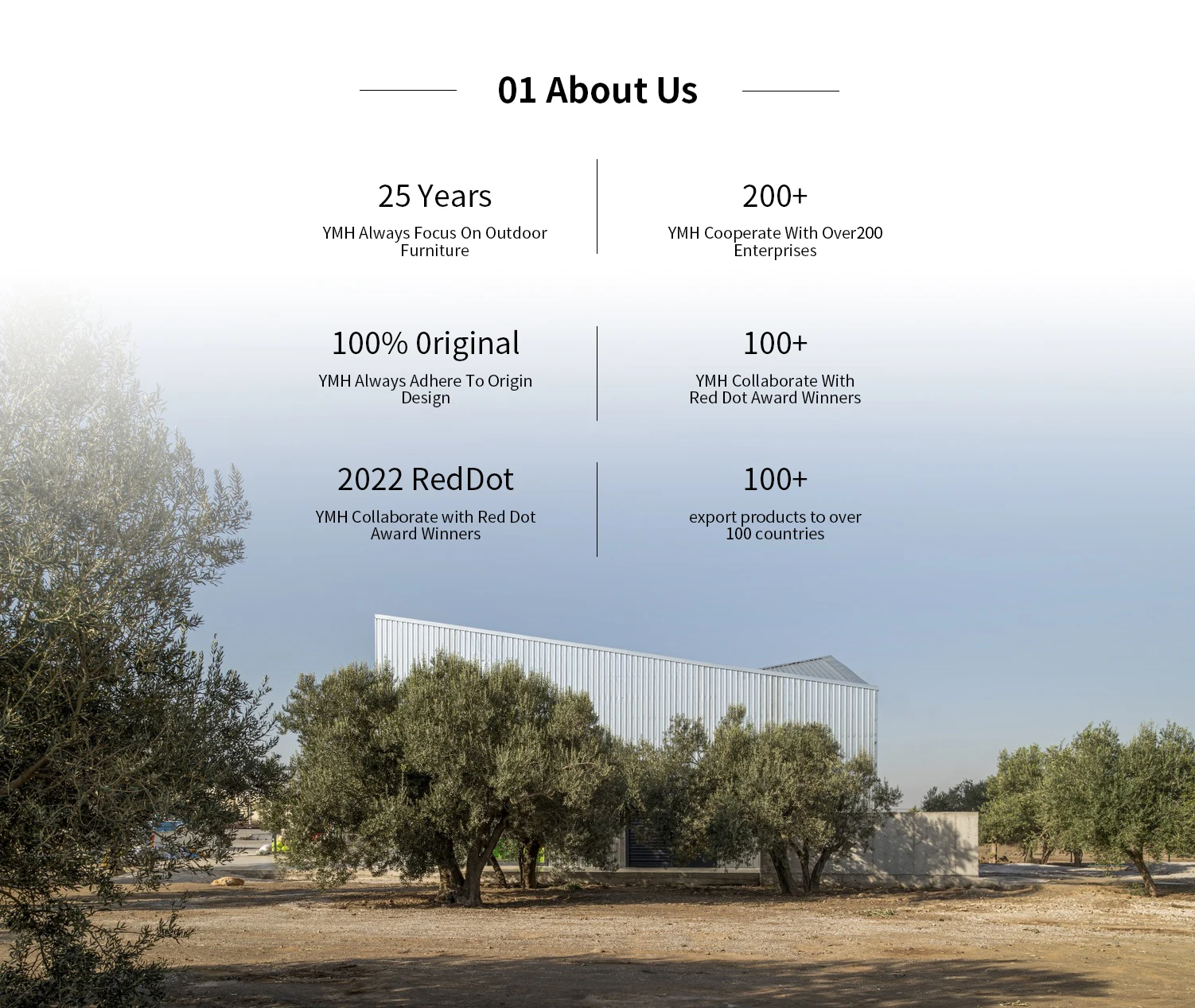 Foshan Yumuhong Furniture Co Ltd. was founded in 2013, YMH Dedicated to providing high quality, innovative design of outdoor furniture products, covering gardens, terraces, courtyards and outdoor leisure Spaces. We take customer first as the purpose, provide customized solutions and a full range of service support, and cooperate with a number of global well-known brands to ensure product quality and supply stability.We look forward to working with you锛�