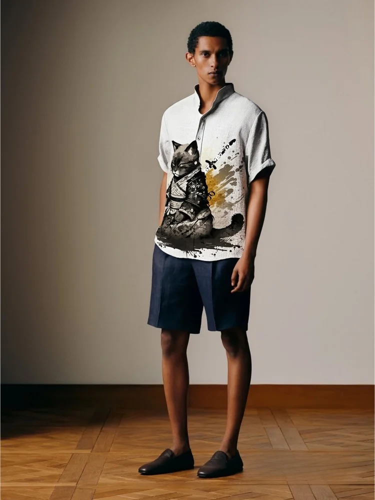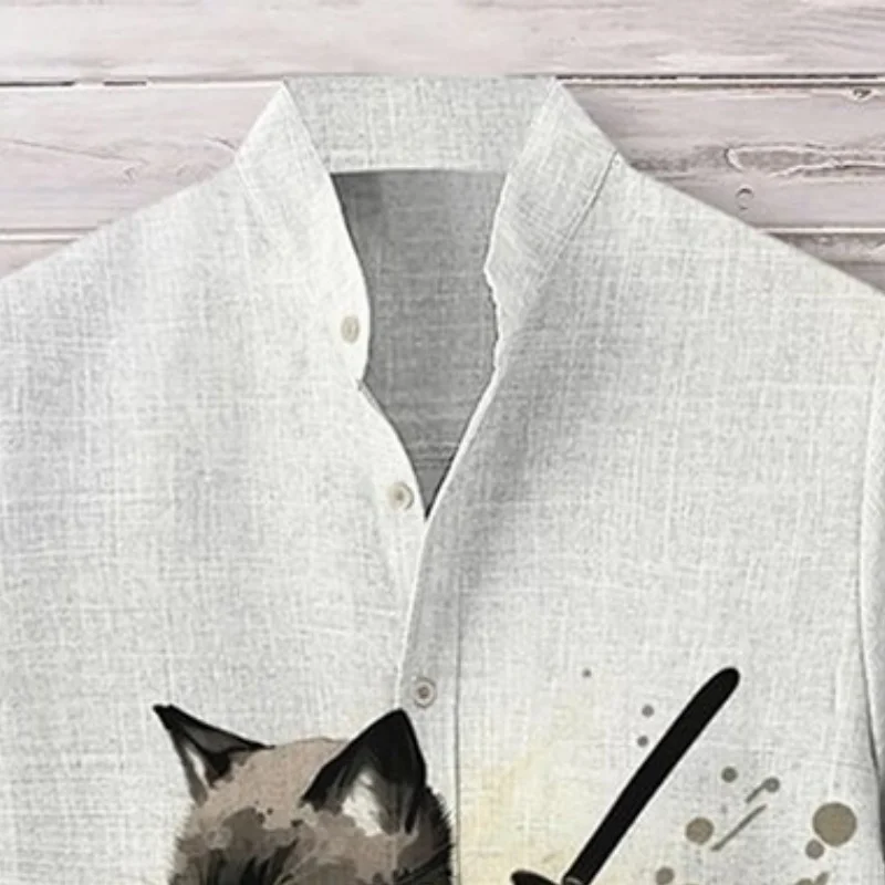 Men's Clothings Blouse Japanese Samurai Cat Meditating Art Linen Blend Cozy Shirt Short Sleeve Retro American Style Harajuku Top