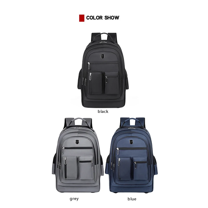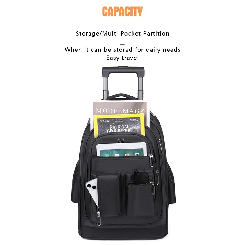 The rolling bookbag with multiple pockets and compartments design; Can accommodate computers, magazines, documents, books, gadgets, clothing, etc., keeping your items organized and easy to access