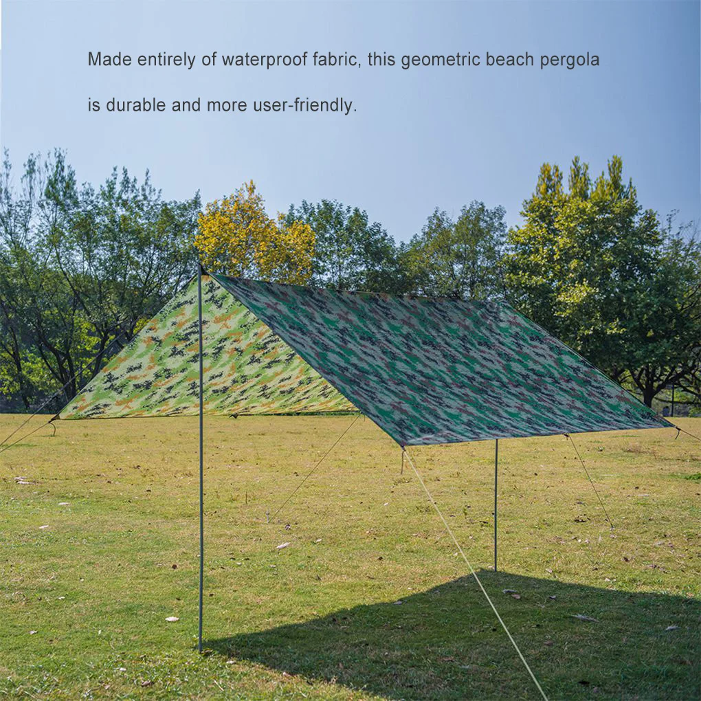 Made entirely of waterproof fabric, this geometric beach pergola is durable and more user-friendly.