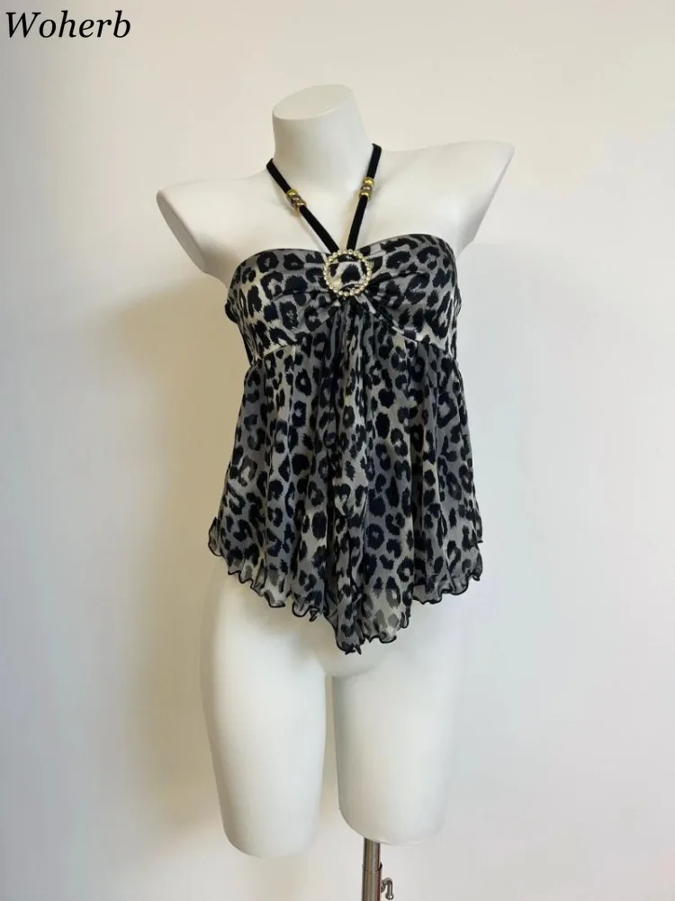 Women Clothing Summer Crop Tops 2025 Ropa Mujer Halter Backless TLoose Vest Sweet Korean Camis Korean Leopard Print Sexy Tanks