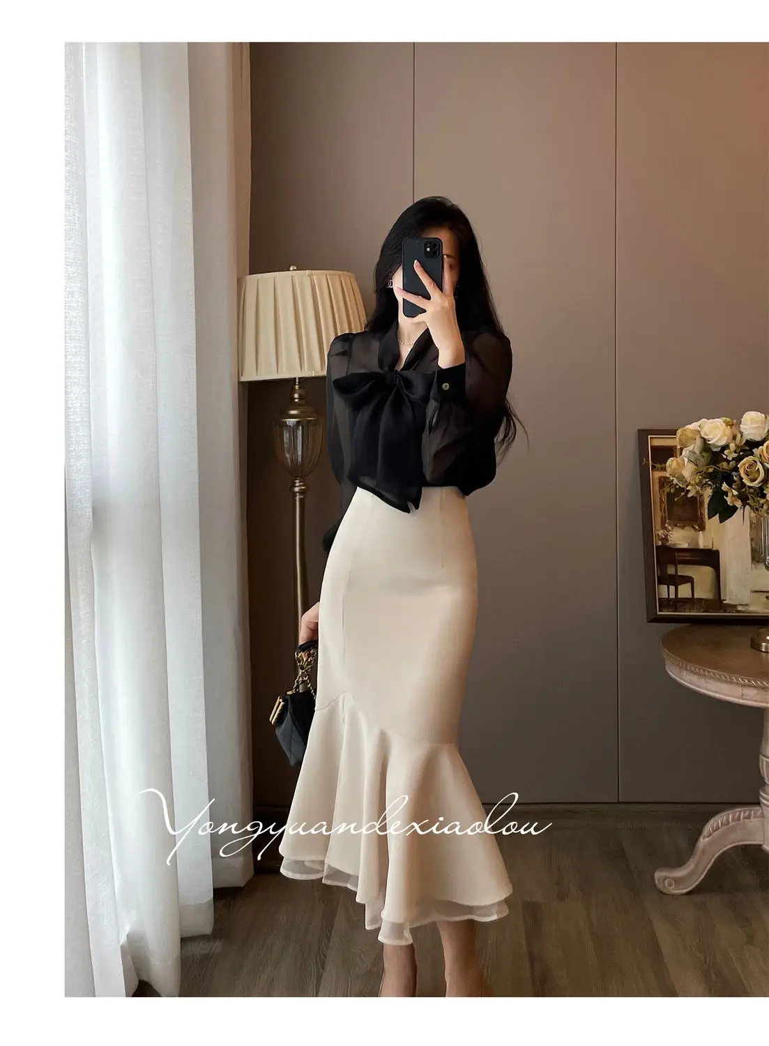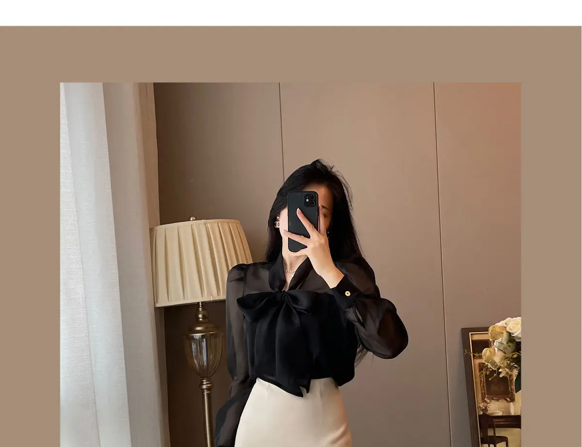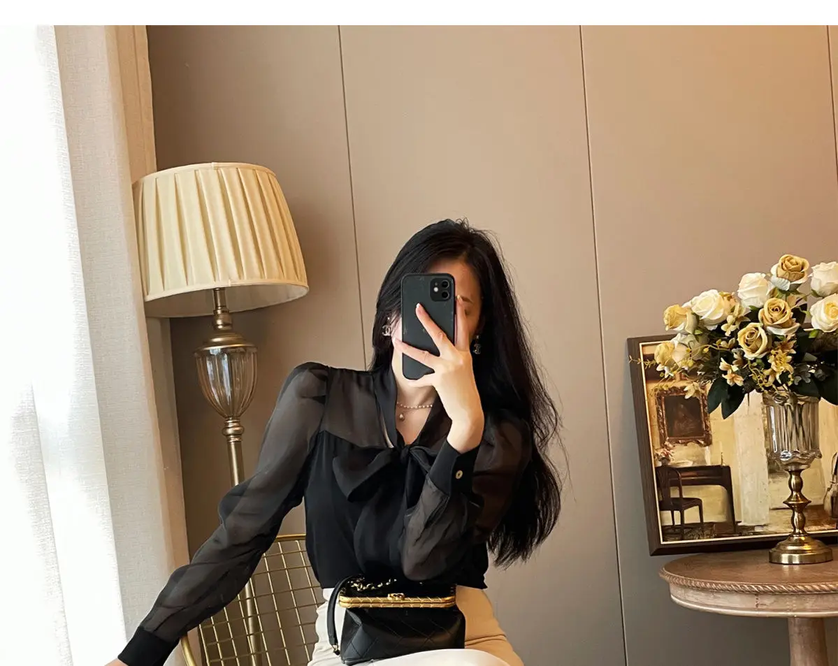 Women Clothing Temperament Chiffon Bow Lacing Thin Shirt Tops Spring Summer New Long Sleeve Solid Elegant Blouse Sexy Fashion