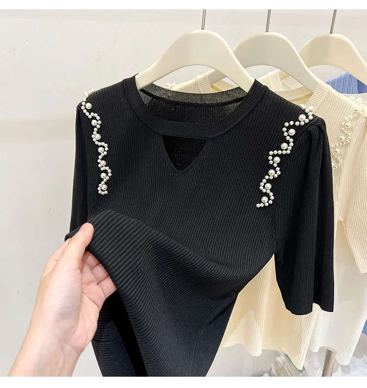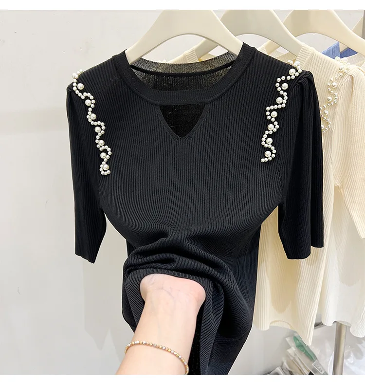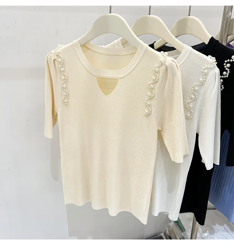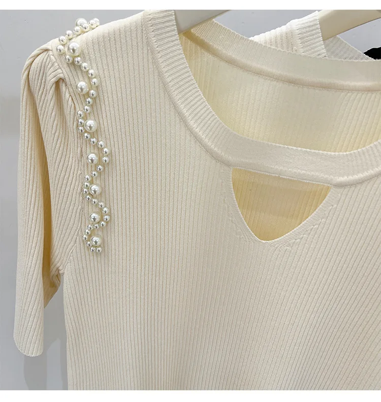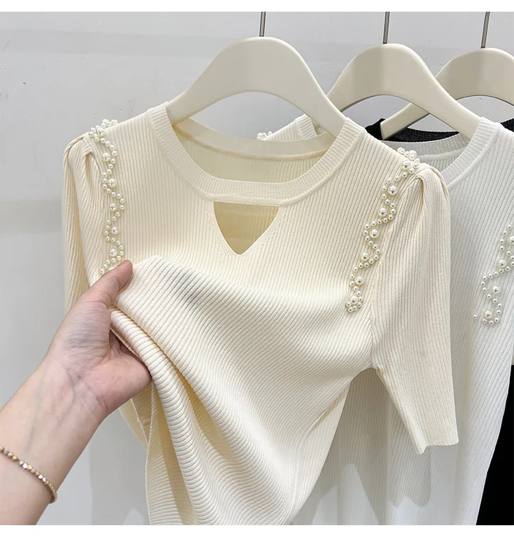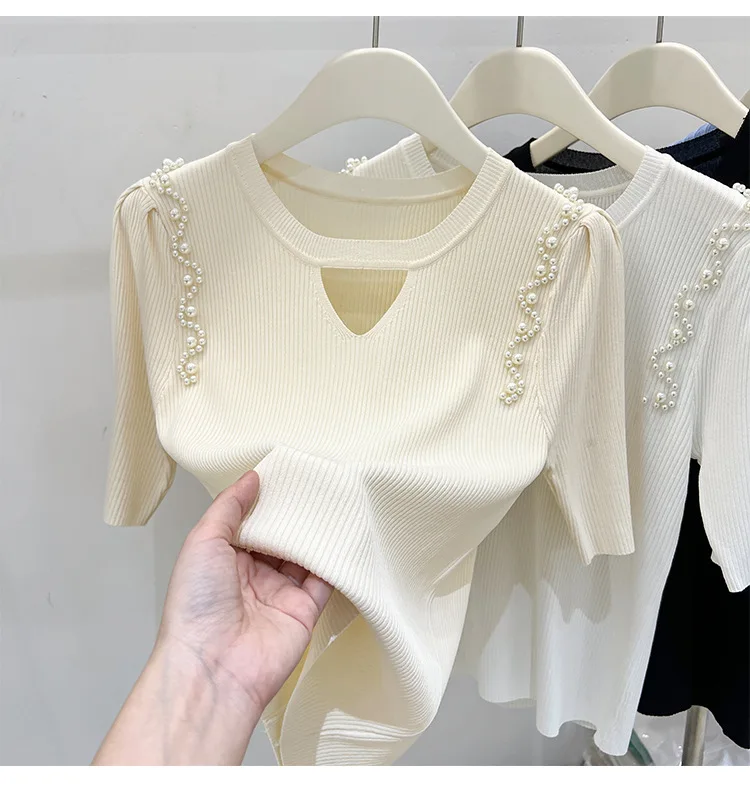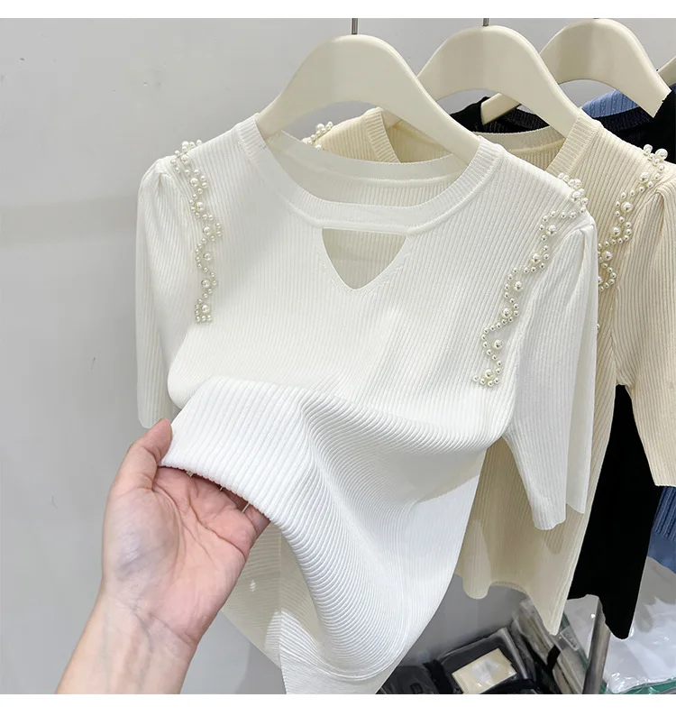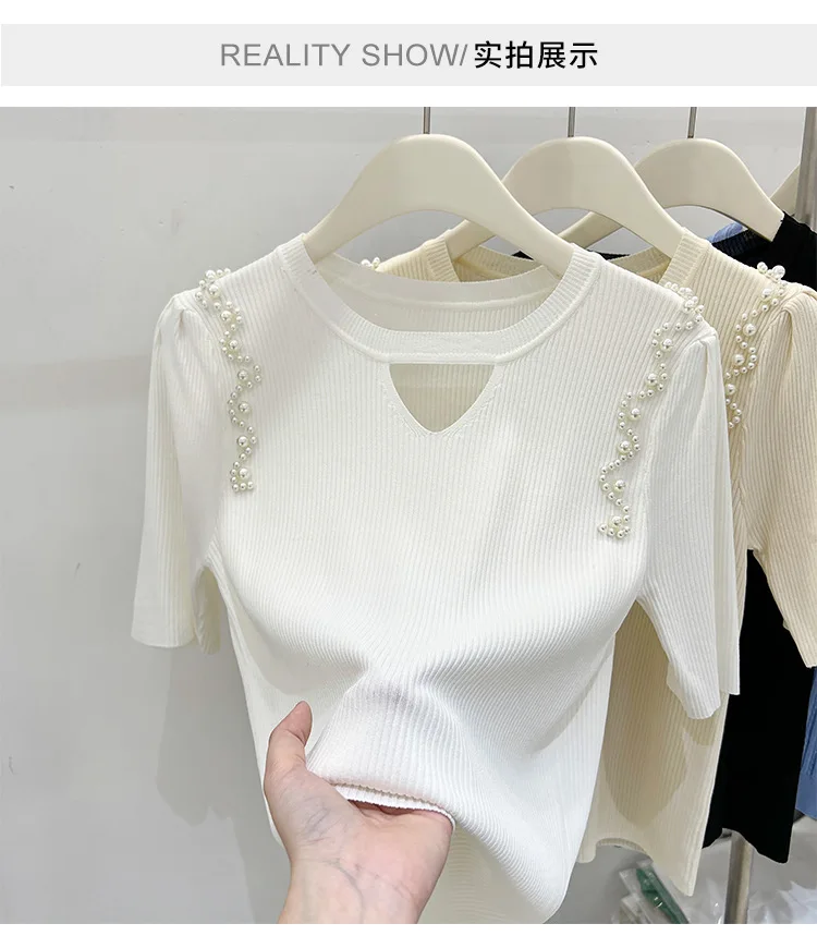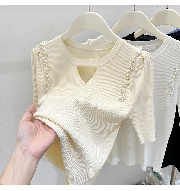Women's Clothing Pretty Fashion T-Shirt Summer Hollow Out Knit Pearl Sleeve Short Tee Lady Versatile V-neck Sweet Spicy Wind Top