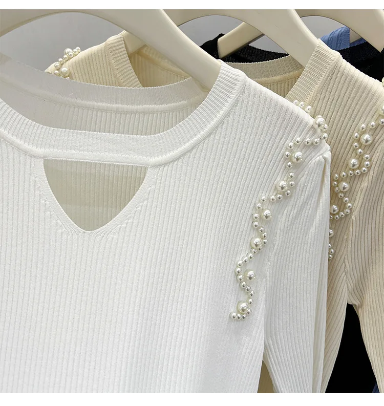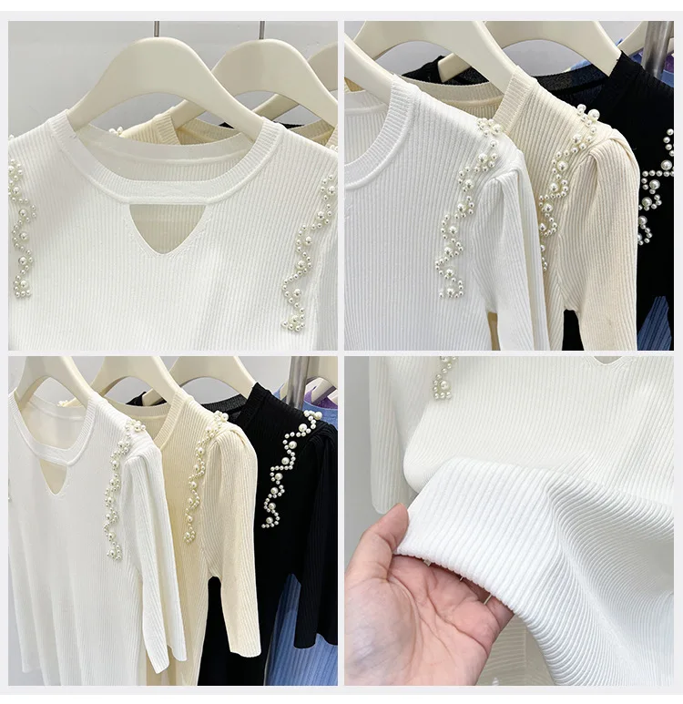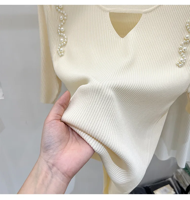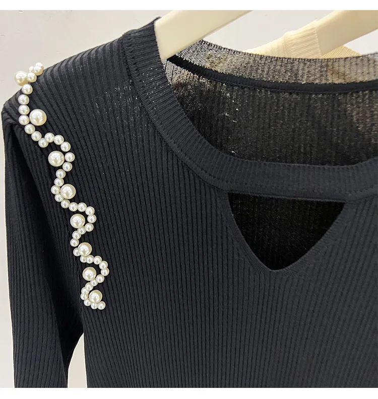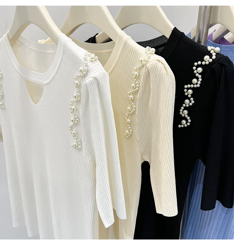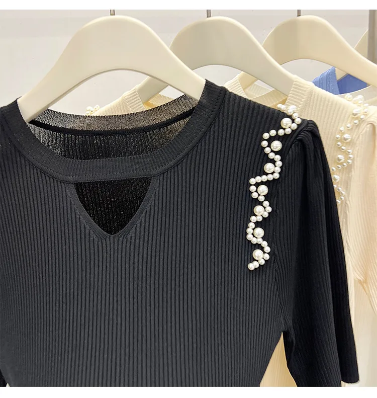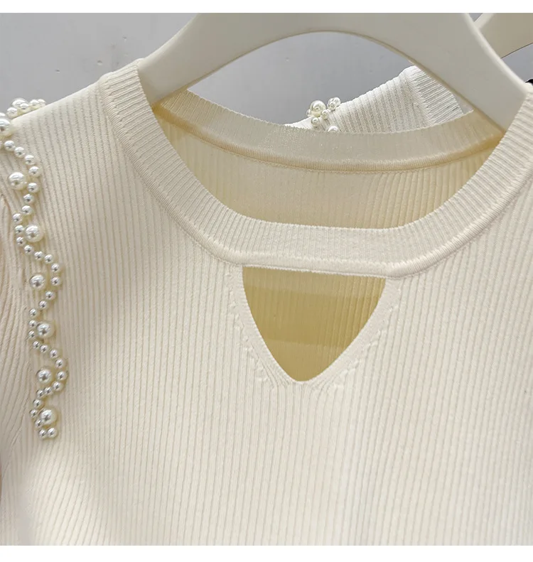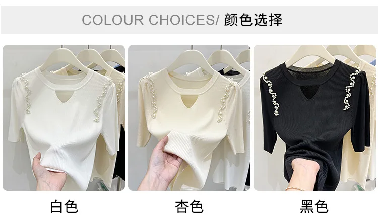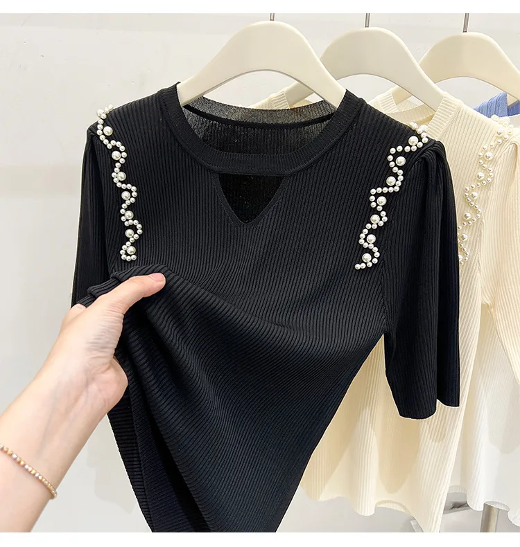 Women's Clothing Pretty Fashion T-Shirt Summer Hollow Out Knit Pearl Sleeve Short Tee Lady Versatile V-neck Sweet Spicy Wind Top