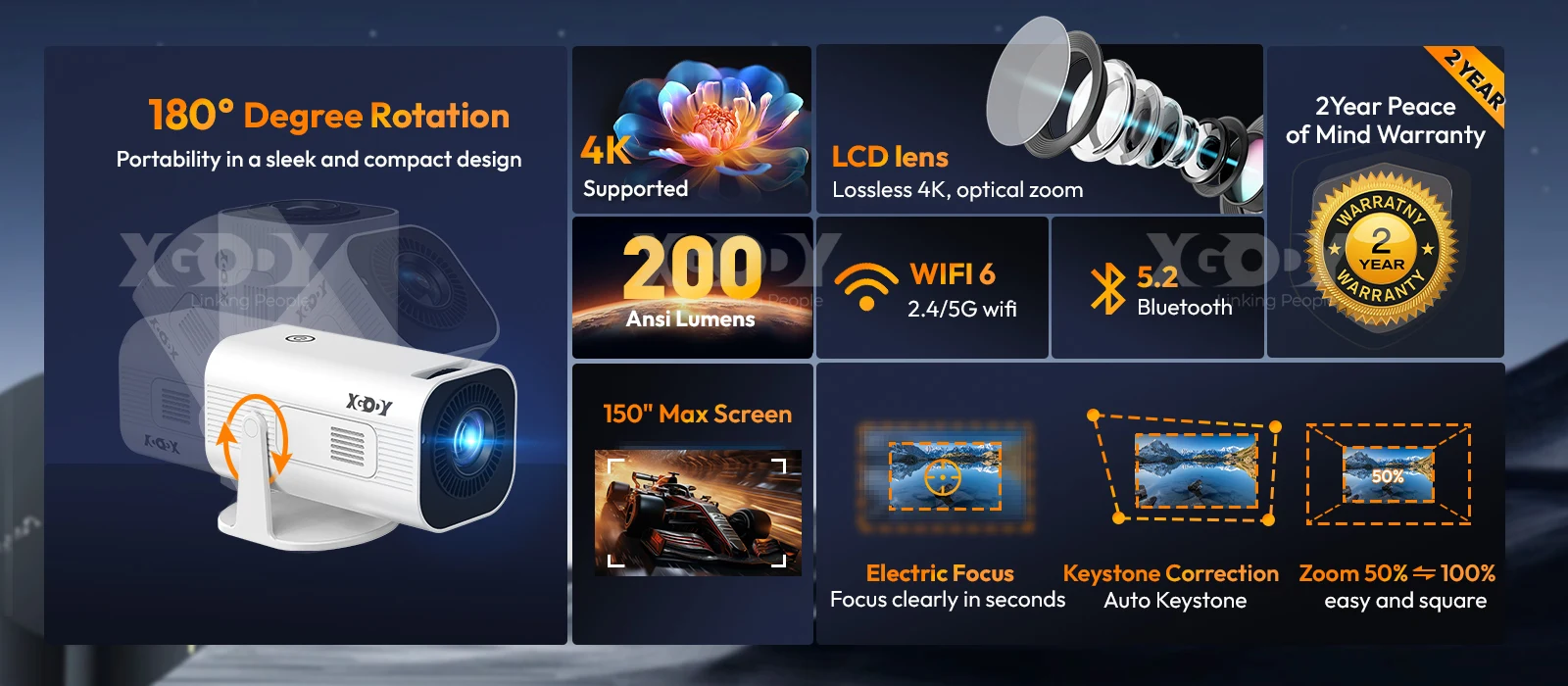 ��5G WiFi & BT5.0 Mini Projector:The XGODY M1 projector utilizes 5G WiFi technology, which offers a high transmission rate and low latency, enabling instant screen synchronization.The integrated BT5.0 chip can establish connections with various Bluetooth devices such as Bluetooth speakers and headphones, enabling Hi-Fi audio transmission.